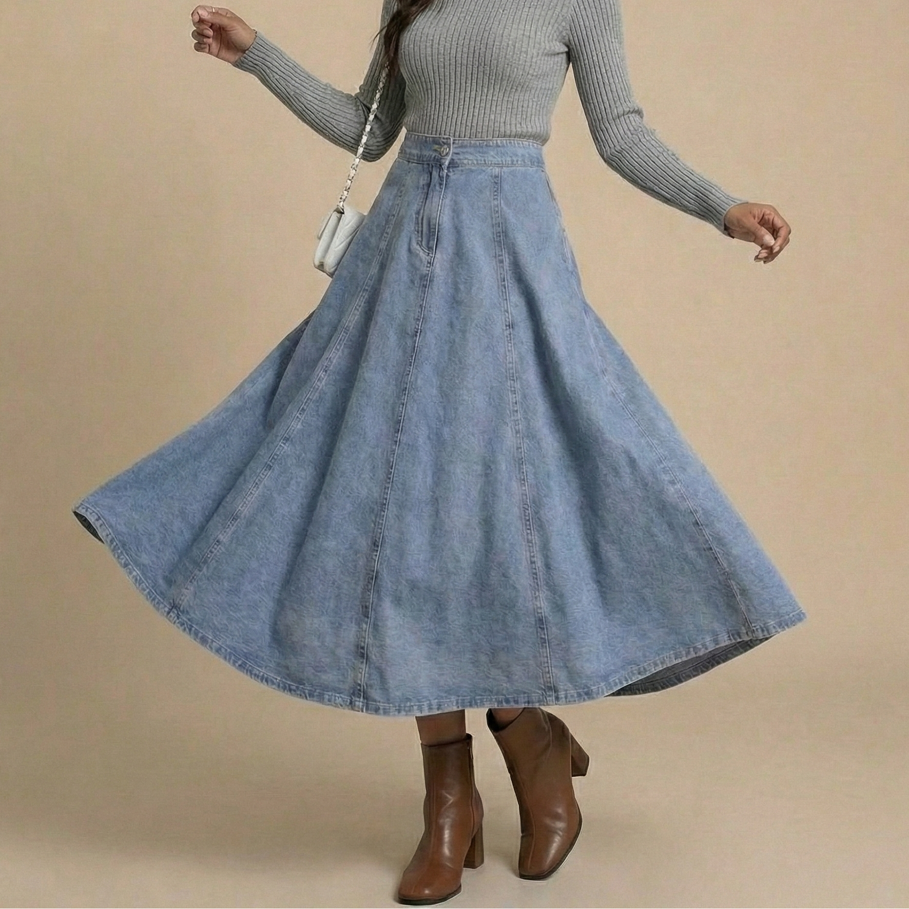 The light-wash denim is elevated through clean lines and a sweeping hem for an effortless Parisian charm.